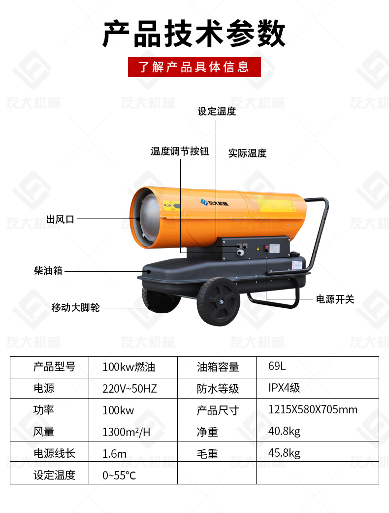 100kw燃油暖風機大風量,升溫快,可滿足大面積取暖要求。此設備燃燒結構經過了優化,大大提高了燃料利用率,即可快速升溫加熱,縮短等待時間。而且其溫控裝置非常靈敏,保證加熱溫度,節約燃料消耗,是經濟實惠的選擇。