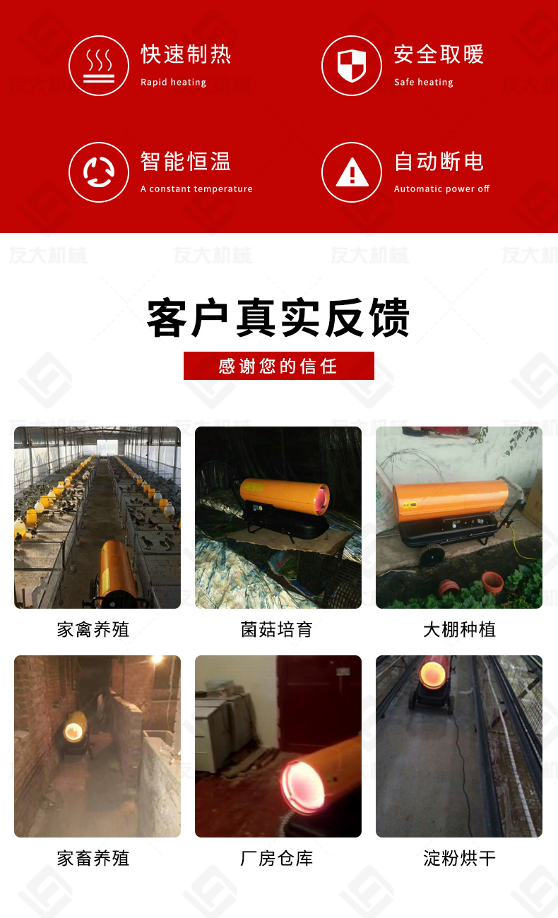 適用范圍:☆養殖、廠房、車間、建筑工地、辦公室、宿舍等局部取暖設施。 ☆任何需要加溫的場所。